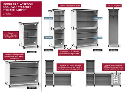 Luxor's modular classroom bookshelf/teacher storage cabinet is an innovative, mobile classroom storage system that makes it easy to organize school supplies such as books, toys, robotics, and more. Features include durable steel construction, height-adjustable classroom shelves, full-swivel 1.5"Dia. casters (two with locking brakes) for easy mobility, and a sturdy tabletop surface that provides additional work or storage space. Best of all, the classroom storage cabinet includes hardware that lets you easily connect it with compatible storage units, reading stations, and more.