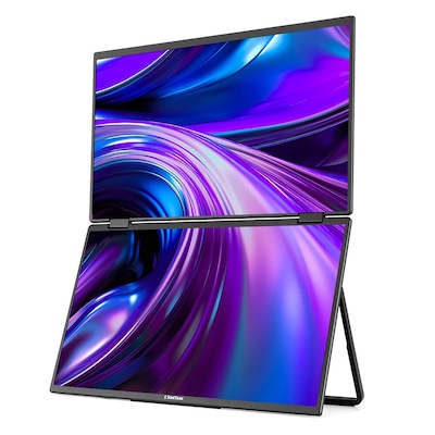- Ergonomic, foldable portable monitor with a stacked dual-screen and hinge design, enabling triple the screens and a clutter-free workspace