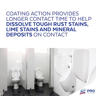 Optimize restroom cleaning time with a thick 9.5% hydrochloric acid formula that works through the toughest toilet stains in seconds and coats above and below the waterline. Lysol® kills 99.9% of viruses and bacteria when used as directed.