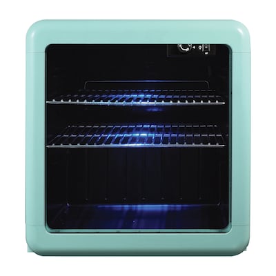 The Magic Chef 1.7-Cu. Ft. Retro Beverage Cooler in Green will be the ideal addition to any dorm, office, or rec room. The stylish nostalgic look will complement any decor. The LED blue lighting showcases your beverages. The tinted double-pane glass door is more energy efficient than single-pane glass and helps prevent condensation. There are 2 removable wire shelves which can be adjusted according to your beverages. The beverage cooler offers a 1-year parts-and-labor warranty and 5-year compressor-part warranty.