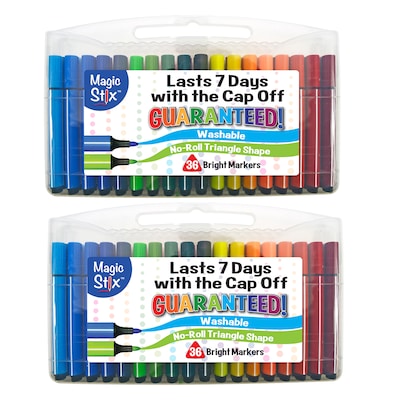 Easy-Grip Triangular Markers that won't dry out! Featuring a never-roll triangular shape. Magic Stix markers are a revolutionary product to bring safe, creative fun to your crafts! Features a triangular shape to promote proper grip, and help develop fine motor skills. Magic Stix are guaranteed to bring long lasting color to the page with the cap off for up to 7 days without drying out. These washable and non-toxic markers will remain fresh use after use, project after project. Each pack includes 36 markers. Sold as 2 packs for a total of 72 markers.
