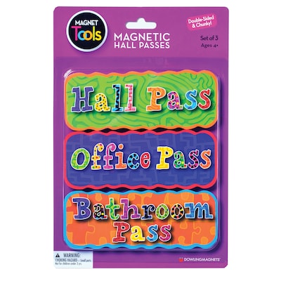 Dowling Magnets® Magnetic hall pass set of 3 includes double-sided magnetic hall, office and bathroom passes with chunky foam core. Magnetic hall pass set in bright color announce permission has been granted to students to leave the classroom.