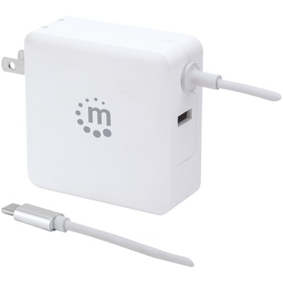 Enjoy complete charging power with this Manhattan 60-Watt Power Delivery Wall Charger with Built-in USB-C Cable in white. The charger's attached USB-C cable uses Power Delivery (PD) technology to provide plenty of power to laptops and mobile phones, and the additional USB-A port can quickly charge any handheld device or tablet. It's the ideal companion for travelers with its stylish, compact and ultra-modern design. It also intelligently safeguards itself and your devices with its short circuit, overvoltage, overcurrent and overtemperature protection functions.