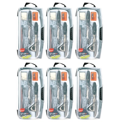 Maped 10-piece geometry study set provides everything a student needs to be prepared for class. High-quality eraser makes correcting mistakes clean and simple. Shatterproof box keeps everything safely organized and protected for easy storage. Each set includes 1 study metal compass with pencil holder, 1 study metal compass with lead, 1 pencil sharpener, 1 eraser, 1 pencil, 1 ruler, 1 protractor, 2 set squares, and 1 pack of leads. Sold as 6 sets.