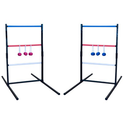 Be the first player or team to score 21 points. Points are scored by wrapping or landing bolas on any of the three colored crossbar. Ladders are placed 25' apart. Play as singles (2 players) or teams (4 players). One player/team throws the red bolas and the other plays blue. Players stand next to one ladder and toss to opposite ladder. Play continues back and forth between the two ladders. Contents include: 4-A Uprights, 4-B Uprights, 4-Upright Connectors, 4-T-Connectors, 8-Black Base Bars (weighted), 2-Blue Crossbars, 2-Red Crossbars, 2-White Crossbars, 2-Black Crossbars, 3-Red Bolas, and 3-Blue Bolas.