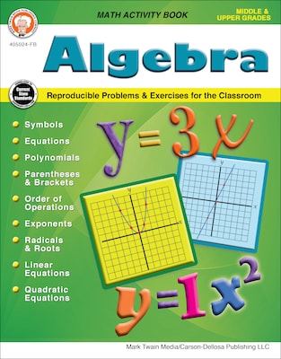 The Algebra resource book for fifth to twelfth grades provides practice in these essential algebra skills:-variables-polynomials-radicals and roots-linear equations-quadratic equationsThis Mark Twain math resource offers clear explanations, practice exercises, and unit review quizzes.