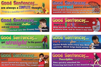Mark Twain "Good Sentences" Bulletin board set is ideal for grades 4 - 8+ and includes 8 strips that measures 21" x 6" each. Board provides helpful guidelines for writing good sentences and examples displaying those guidelines.
