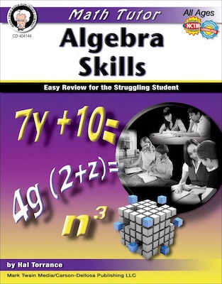 Mark Twain "Math Tutor: Algebra" Resource book for grades above 6 features factoring, exponents, variables, linear equations and polynomials. Book with 80 pages offers practice exercises and vocabulary definitions to improve skills of math.