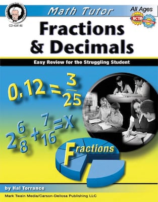 Mark Twain "Math Tutor: Fractions and Decimals" Resource book for grades 4 and above features adding/subtracting/multiplying/dividing fractions. Book with 80 pages offers practice exercises and vocabulary definitions to improve skills of math.