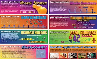 - Focus on natural, whole, rational, and irrational numbers, integers, and real numbers