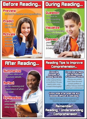 - Four charts (17" x 24" each) feature tips for helping students understand and remember what they read by utilizing nine reading comprehension strategies that can be used in all situations