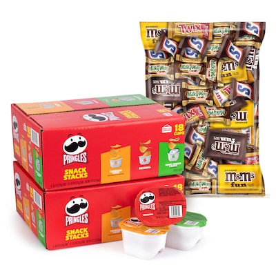 - Includes one (1) 62.6-ounce bulk bag filled with fun size and mini M&MS Milk Chocolate, M&MS Peanut, SNICKERS, TWIX, and MILKY WAY chocolates and two (2) 18-counts of Pringles Stack Chips Grab & Go Variety Packs