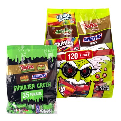 Fill your candy bowl with this Halloween assortment of gummy and chocolatey Halloween candy. These bulk candy bags are a mix of mini and fun size individually wrapped candies that are perfect for sharing at Halloween parties or passing out to trick-or-treaters. Each bag is filled with some of your favorite candy brands, including SNICKERS chocolate bars, SKITTLES gummies, MIKY WAY chocolate bars, LIFE SAVER gummies, 3 MUSKETEERS chocolate bars and TWIX caramel cookie bars. In addition you get a 35 count of the spooky favorite Ghoulish Green SNICKERS chocolate bars and Ghoulish Green TWIX caramel cookie bars. This Halloween candy variety bundle is filled with enough candy to last you through Halloween night, and still have enough left over to treat yourself.