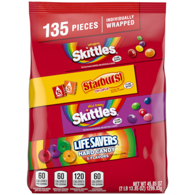 Give your tastebuds a mouth-watering experience with this Mars Skittles, Starburst, and Life Savers bulk bag of chewy and hard candy. Stick your hand in this candy bag full of individually wrapped pieces of Skittles Original and Skittles Wild Berry chewy candy, Starburst chewy candy, and Life Savers hard candy. Make celebrations extra-sweet by filling your candy buffets, party favors, and pinatas with individually wrapped chewy and hard fruit-flavored candy. Guests will be smiling ear to ear thanks to these yummy fruit-flavored sweets. Are you in charge of office snacks? Increase team morale by filling up the office candy dish with this bag of candy. Eliminate those afternoon slumps and let Skittles, Starburst, and Life Savers turn those frowns upside down. Add this bulk assortment of Skittles, Starburst, and Life Savers chewy and hard candy to your cart today for a fruity and fun tomorrow.