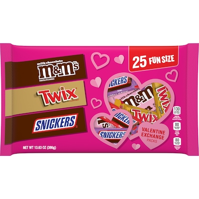 - This Valentine's Day chocolate assortment includes fun size SNICKERS Chocolate Candy Bars, TWIX Candy Bars and M&M'S Milk Chocolate Candy packs
