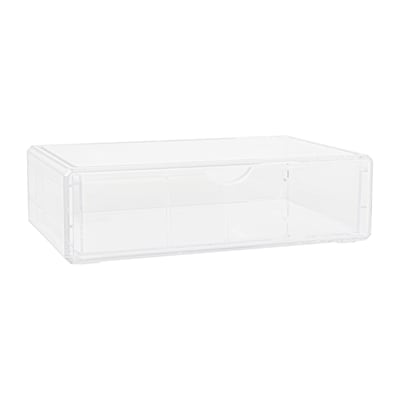 Organize a multitude of supplies and accessories with the Martha Stewart Brody Organizer Box with Drawer and keep all of your surfaces clutter-free. Premium BPA-free and crack-resistant plastic holds up well in almost any environment from your desktop toyour bathroom vanity for many years of use. The removable drawer is accented with a half-moon cutout allowing for easy opening and closing while the crystal clear housing makes locating your items effortless. The stackable design enables you to use vertical instead of horizontal real estate, which makes this storage drawer a great space-saver Lower grooves lock in place for stability and non-skid feet ensure the box stays in your desired location to maintain a neat and tidy appearance.