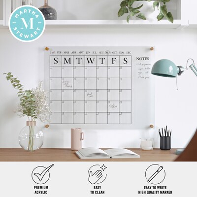 Organize your life and your desktop with the Martha Stewart Acrylic Monthly Wall Mounted Calendar with Notes. The polished edges eliminate the need for a frame while the included mounting hardware gives a dimensional appearance for a chic statement anywhere in your home. Comprised of premium crystal clear acrylic for enhanced strength and overall brightness, this wall organization set is scratch-resistant and waterproof for long-lasting use. Supplemented with a monthly blocked calendar available in 2 printed colors and a dry erase marker for adding important dates that can be wiped clean with a dry cloth and repopulated at the start of each new month.