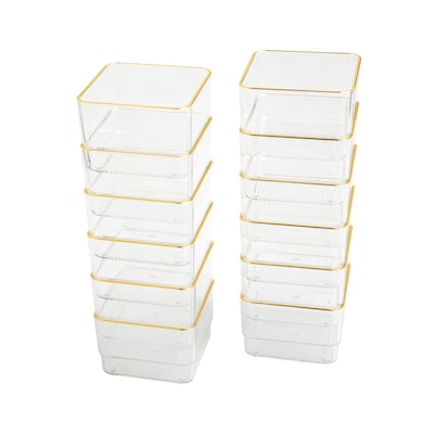 Thoughtful, functional storage is at your fingertips with this 12 pack of 3" x 3" Martha Stewart Kerry Stackable Organizers. Clear, BPA-free plastic bins are elevated by beautiful gold trim and can be configured on demand for a custom fit in a drawer or on top of your work surface. Recessed bottoms allow the components to slide from side to side for quick access and stack vertically making them an ideal storage solution for small spaces. Non-slip feet ensure these organizer trays stay where you put them and the sophisticated, versatile design multitasks in countless other living spaces requiring tidy, clutter-free surfaces.