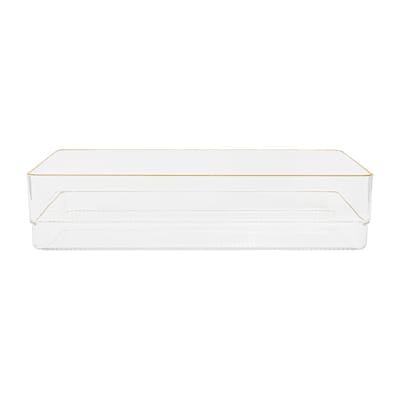 Thoughtful, functional storage is at your fingertips with this 3 pack of 12" x 6" Martha Stewart Kerry Stackable Organizers. Clear, BPA-free plastic bins are elevated by beautiful gold trim and can be configured on demand for a custom fit in a drawer or on top of your work surface. Recessed bottoms allow the components to slide from side to side for quick access and stack vertically making them an ideal storage solution for small spaces. Non-slip feet ensure these organizer trays stay where you put them and the sophisticated, versatile design multitasks in countless other living spaces requiring tidy, clutter-free surfaces.