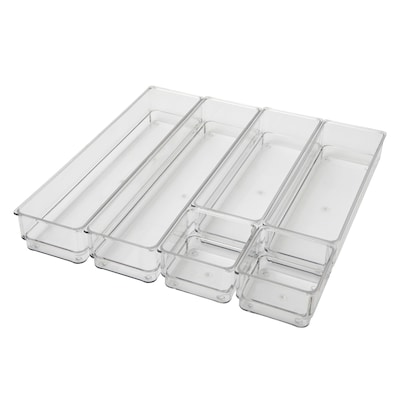 Functional storage meets elevated style in this variety Set of 6 Martha Stewart Miles Stackable Organizers. Clear, crack resistant, and BPA free, these premium plastic bins can be configured on demand for a custom fit in a drawer or on top of your work surfaces. Recessed bottoms allow the components to slide from side to side for quick access and conveniently stack giving you vertical storage solutions for small spaces. Non-slip feet ensure these organizer trays stay put anywhere in your home they are placed allowing for tidy, clutter-free surfaces.