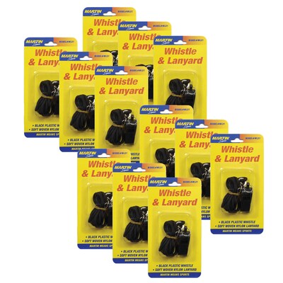 Martin Sports Whistle & Lanyard includes a nylon lanyard with a small plastic whistle. Ideal for coaches and teachers, this convenient combo features a metal J-hook for quick and easy attachment. Sold as a pack of 12 whistles total.