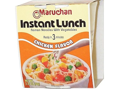 Stock up on these soup packs and have an instant meal ready in three minutes. Maruchan chicken soup packs are packaged in single-serve cups and feature ramen noodles, mixed vegetables, and chicken flavor.