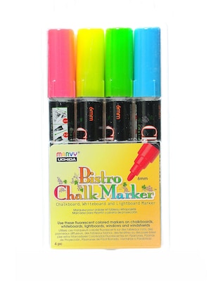 Bistro Markers are available in sets of 4 in fine point, broad point and chisel tip in a variety of color combinations. These markers are great on chalkboards, light boards, windows, and windshields. They are opaque, water based, and erasable with a damp cloth when dry.
