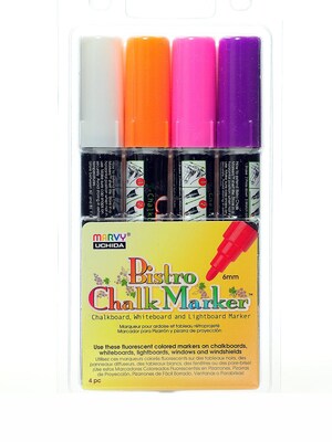 Bistro Markers are available in sets of 4 in fine point, broad point and chisel tip in a variety of color combinations. These markers are great on chalkboards, light boards, windows, and windshields. They are opaque, water based, and erasable with a damp cloth when dry.