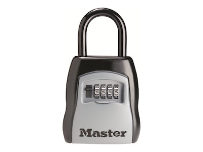 Secure doors and valuables with this black and silver locking combination five-key steel box. This lock lets you set your own combination, so you can be sure it's easy to remember, while the protective weather cover helps prevent jamming and freezing. This Master Lock locking combination five-key steel box features a molded body and vinyl-coated shackle to protect against scratches.