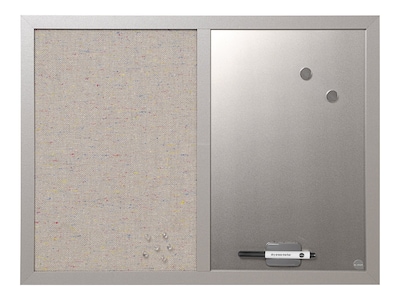 Take notes or leave messages easily with this combo fabric/dry-erase MasterVision. Save paper with this combo board. The dry-erase writing surface is also magnetic for multipurpose use and the fabric half works as a bulletin surface. The Elegant gray wood frame adds a professional look, and the dry-erase surface wipes down completely with no staining or ghosting.