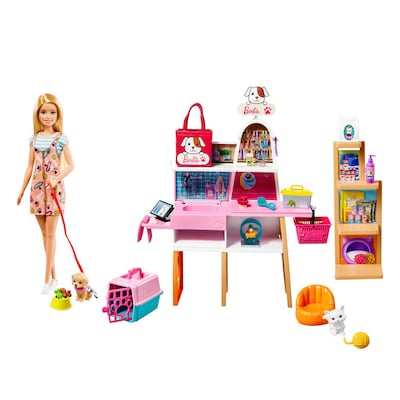 Barbie Doll (11.5" Blonde) and Pet Boutique Playset with 4 Pets, Color-Change Grooming Feature and Accessories, Great Gift for 3 to 7 Year Olds. Welcome to the Barbie Pet Boutique Playset, where kids will find everything they need to help Barbie doll care for her animal friends! This playset inspires nurturing play and friendship stories with a grooming station, checkout counter, shelving unit, and over 20 themed play pieces. To help Barbie doll groom her puppy, flip the counter up to reveal a grooming station. Dip the included sponge in warm water and help puppy wash up, then watch his muddy spots vanish! After they've cleaned up, Barbie doll can shop for treats and toys or adopt a new pal. With four pets, fun features and so many accessories, this Barbie pet store playset inspires endless storytelling for 3 to 7 year olds. Doll cannot stand alone. Colors and decorations may vary.