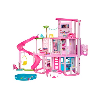 Welcome to the Barbie Dreamhouse, where 360-degree play inspires endless fun! This updated version of the iconic doll house features an open design, premium features and 75+ storytelling pieces. Barbie can host the pool party of her dreams with her home's spectacular three-story spiral slide. Watch as Barbie doll and her friends swirl down the slide into the pool! Dolls not included. This doll house doubles as a veritable pet palace, and even includes a puppy figure! Furry friends will have a blast with the pet elevator, pet slide and pool, pet bed, doggie door and pet house. ?Right from the start, kids can spend hours exploring ten different play areas: a kitchen, living room, dining room, bedroom, bathroom, closet, bonus room, balcony, pool and the biggest slide yet. The pool party can turn into a slumber party with space to sleep four dolls! The living room console transforms into the ultimate sleepover spot with a starry backdrop and an extra bed for two.? Dreamy features include integrated lights and sounds in the kitchen and bathroom, fun furniture -- including an extra pull-out bed in the bedroom -- and a top-floor balcony with a palm tree. Bring detail to playtime with 75+ storytelling pieces, a working elevator that is wheelchair-accessible, an adorable swing, fabulous closet and more. When kids ages 3 years old and up “step inside” the Barbie Dreamhouse playset, they’ll never run out of stories to tell!??