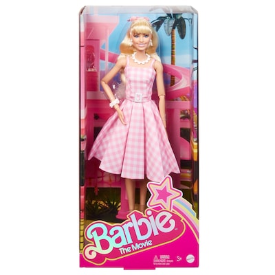 - ?Take home a part of Barbie The Movie with this collector Barbie doll! Wearing a pink gingham dress, she’s all set to have the best day ever in Barbie Land.