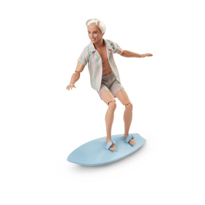 ?Barbie The Movie Ken Doll Wearing Pastel Pink and Green Striped Beach Matching Set with Surfboard and White Sneakers. ?Inspired by the live action feature film, this posable Ken doll commemorates his character on the big screen! ?Greetings from Barbie Land! Inspired by Ken's character in Barbie The Movie, this Ken doll wears a beachy, striped matching set. With a surfboard in tow, he's having the best day ever in Barbie Land! Celebrating Barbie The Movie, this Ken doll makes a great gift for fans and collectors alike. Doll cannot stand alone. Colors and decorations may vary.