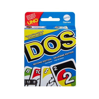 Just like UNO and DOS card games, DOS Second Edition players race to get rid of their cards but with updated cards and rules designed to make the game even more fun for game nights. There are TWO discard piles, and every number "2" card in the deck is a "Wild DOS Card," meaning it can be any color "2" a player wants. Action cards include the classics, plus a "Wild Play Two" card that forces the next player to play at least two cards on their turn, and if they can't, they have to draw two cards. It's twice the action and tons more fun for friends and families on game night. Colors and decorations may vary.