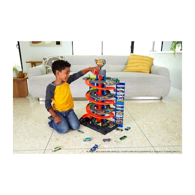 - "The Hot Wheels City Mega Garage playset features four-levels of excitement with an awesome corkscrew elevator, storage for more than 60 Hot Wheels cars, and multiple connection points to create an epic Hot Wheels build!