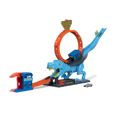 Knock out the dinosaur and save the day in the Hot Wheels City T-Rex Chomp-Down Playset. It features a slam launcher and 9-inch loop where kids launch their Hot Wheel cars just right to defeat the beast. When the dino gets knocked out, its eyes transition from angry yellow to knock-out X-es. Includes one Hot Wheels vehicle and connects to other sets. It's geared toward kids 4 years old and up. Colors and decorations may vary. ?