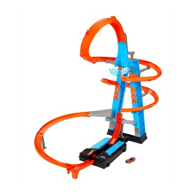 The Hot Wheels Sky Crash Tower is designed for ultimate motorized crashing and racing action with a massive super-cool footprint more than 2.5 feet (36.7 in / 83 cm) high! Kids can boost their vehicles up and up to the sky for a super-cool jump and the most epic mid-air crashes ever! The tower provides parking for 20+ cars, and an orange track that loops multiple times, provides amazing stunting action with a motorized booster for leveraging competition and improving stunting and racing skills. Kids can race multiple cars at the same time, adding more and more cars to create their most epic crashes ever! The Sky Crash Tower set folds up for easy storage and includes one Hot Wheels vehicle.
