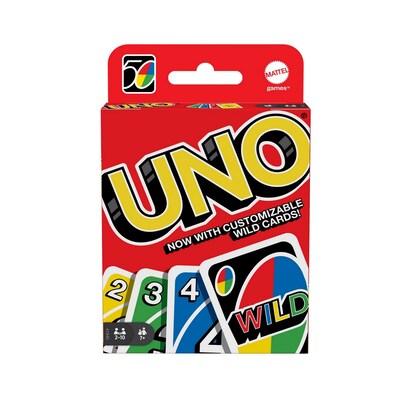 Players take turns racing to get rid of all their cards by matching a card in their hand with the current card shown on top of the deck either by color or number. Special Action cards deliver game-changing moments! Use the Swap Hands card to change hands with any other opponent and write your own rules using the 3 customizable (and erasable) Wild Cards! You’ll find 19 of each color (red, green, blue, and yellow), plus 8 Draw Two, Reverse and Skip cards in every color, along with 4 Wild Cards, 4 Wild Draw Four cards, 1 Wild Swap Hands Card and 3 Wild Customizable cards. If you can’t make a match, you must draw from the central pile! The player to rid themselves of all the cards in their hand scores points for any cards their opponents are left holding. The first player to reach 500 points wins.
