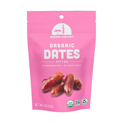 Mavuno Harvest Organic Pitted Dates Snacks are made from organically grown dates with no preservatives or added sugars. These vegan and gluten-free snacks offer naturally sweet, chewy goodness in convenient 4 oz bags, perfect for a healthy on-the-go treat.