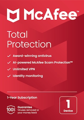 - McAfee Total Protection is basic online protection with award-winning antivirus, AI-powered Text Scam Detector, Secure VPN and identity monitoring.