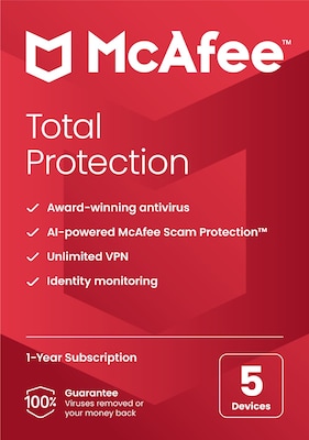 The McAfee Total Protection for five devices provides all-in-one online protection: an award-winning antivirus and online services to protect your security, identity and privacy, so you can live your life online freely and confidently.