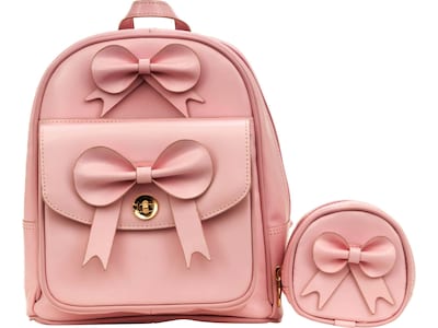 This McKlein ACADIA mini bow backpack features two front pockets: one with twist lock and a slip one. The main compartment features a zipper pocket, two slip pockets, and a multipurpose pocket that can store a mini tablet. Zippers to the main compartment can be locked. The interior is fully lined, and there is also a hidden zipper pocket on the back. Also features adjustable straps and a handle hook for carrying or hanging. Comes with a matching coin purse.