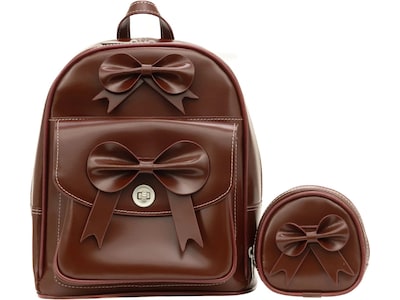 This McKleinUSA ACADIA mini bow backpack features two front pockets: one with twist lock and a slip one. The main compartment features a zipper pocket, two slip pockets, and a multipurpose pocket that can store a mini tablet. The zippers on the main compartment can be locked. The interior is fully lined, and there is also a hidden zipper pocket on the back. The backpack also features adjustable straps and a handle hook for carrying or hanging. Comes with a matching coin purse.