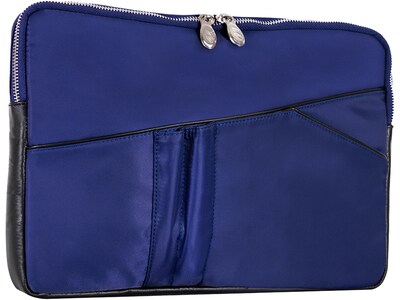 N Series CRESCENT 14" padded laptop sleeve is made of trend-setting lightweight nylon with leather accents that provides easy transportation with proper functionality. Comes in navy color. Features fully-lined interior, and two compartments: easy-access front organizer for pens and small accessories, and back full-length file pocket. Closure is represented with metal zippers and silver accent hardware.