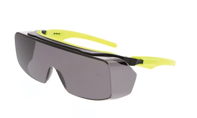 Oversized frame, with 3-position adjustable temple length and lens, the MCR Safety Klondike OTG safety glasses fit over most prescription glasses.