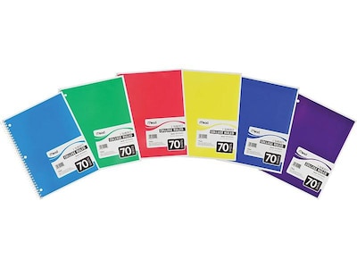 Write ideas, essays and other notes in this spiral notebook. The college-ruled spacing lets you fill this notebook with more words, and the wire-bound spine securely keeps sheets together and is resistant to uncoiling. One notebook per order, color chosen at random.