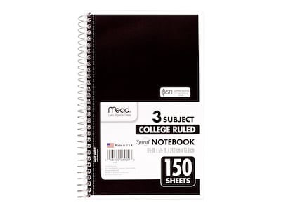 Keep important notes, assignments and other information in one convenient place with this college-ruled notebook. With a compact design, this notebook offers simple portability, and the included three dividers separate sections, so you can easily keep homework, appointment notes and other projects neat and organized. This Mead Spiral assorted-color notebook has 150 sheets of paper and a spiral binding, providing smooth page turning.