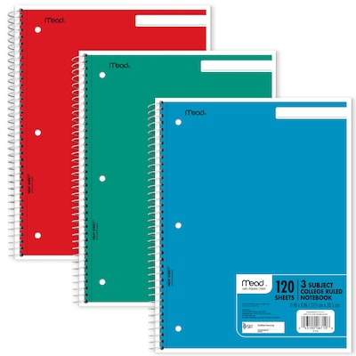Mead Spiral 3-Subject Notebooks, 8.5" x 11", College Ruled, 120 Sheets, Color chosen at random (06710)