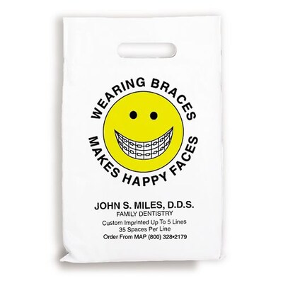 Medical Arts Press® Dental Personalized Large 2-Color Supply Bags; 9 x 13", Happy Face Braces, 100 Bags, (606601)